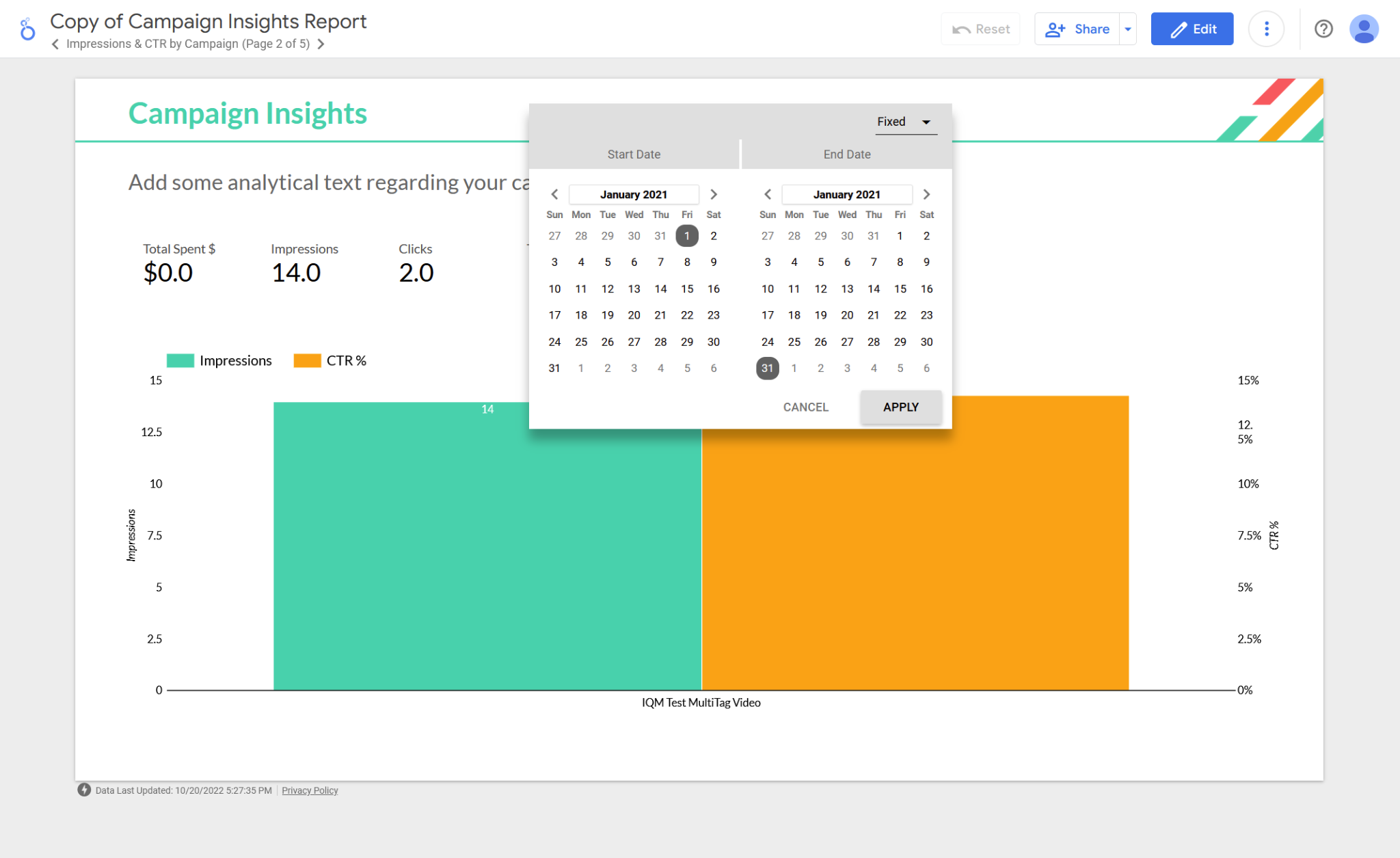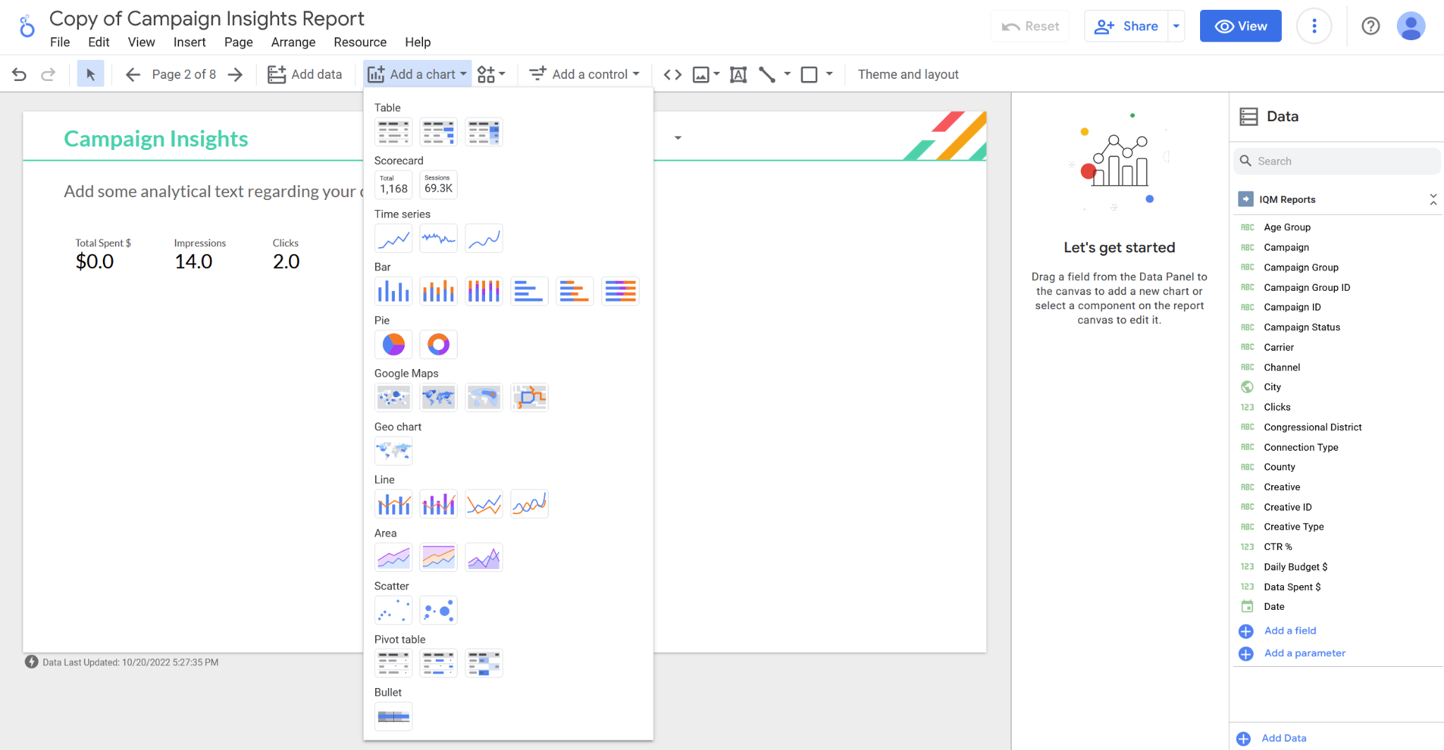 Google Looker Studio is a free online tool for converting data into visual dashboards and reports. The IQM Reports custom connector provides a way to import your IQM ad-serving reporting data into Google Looker Studio, where it can be used to create visualizations.