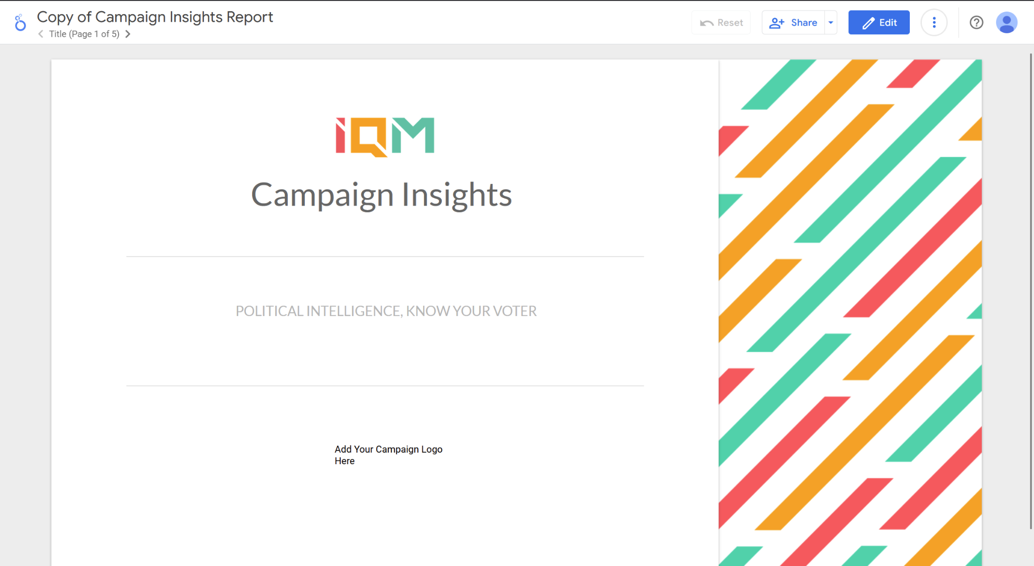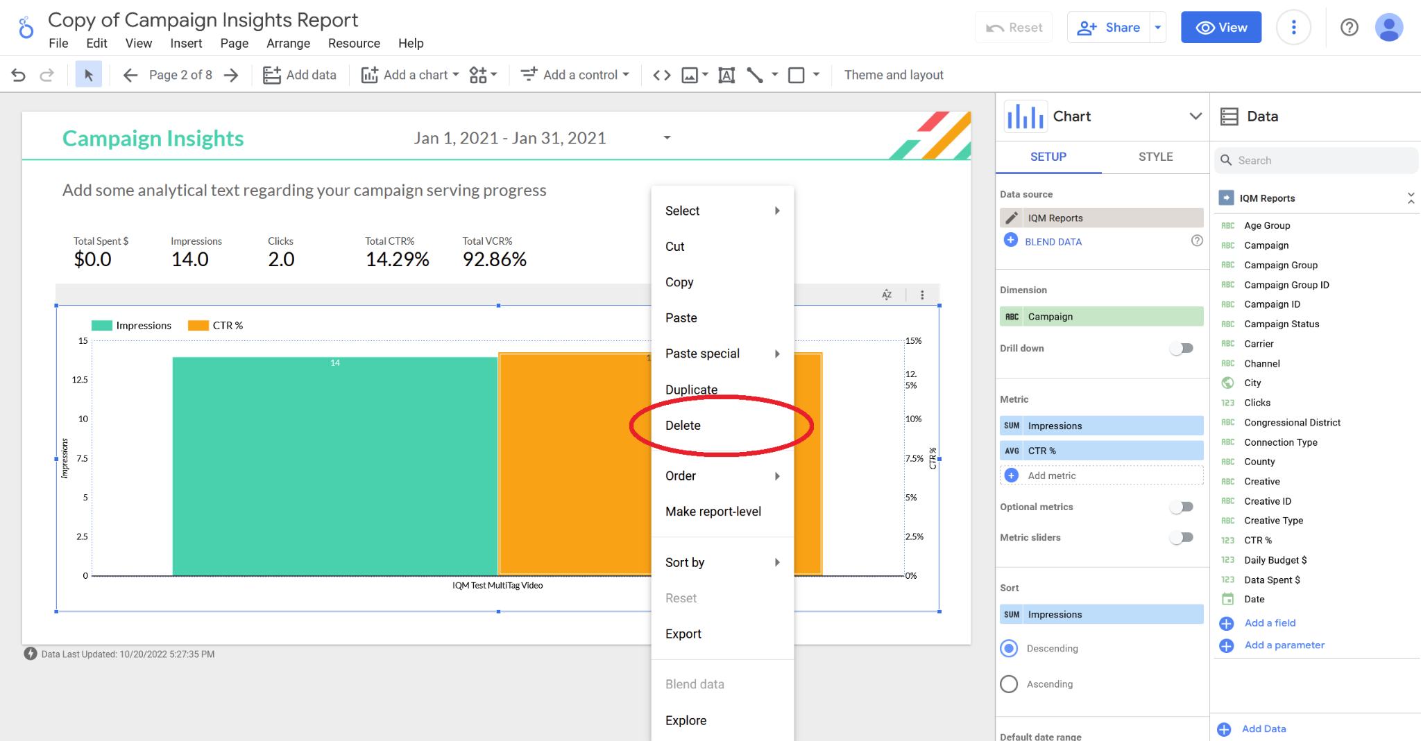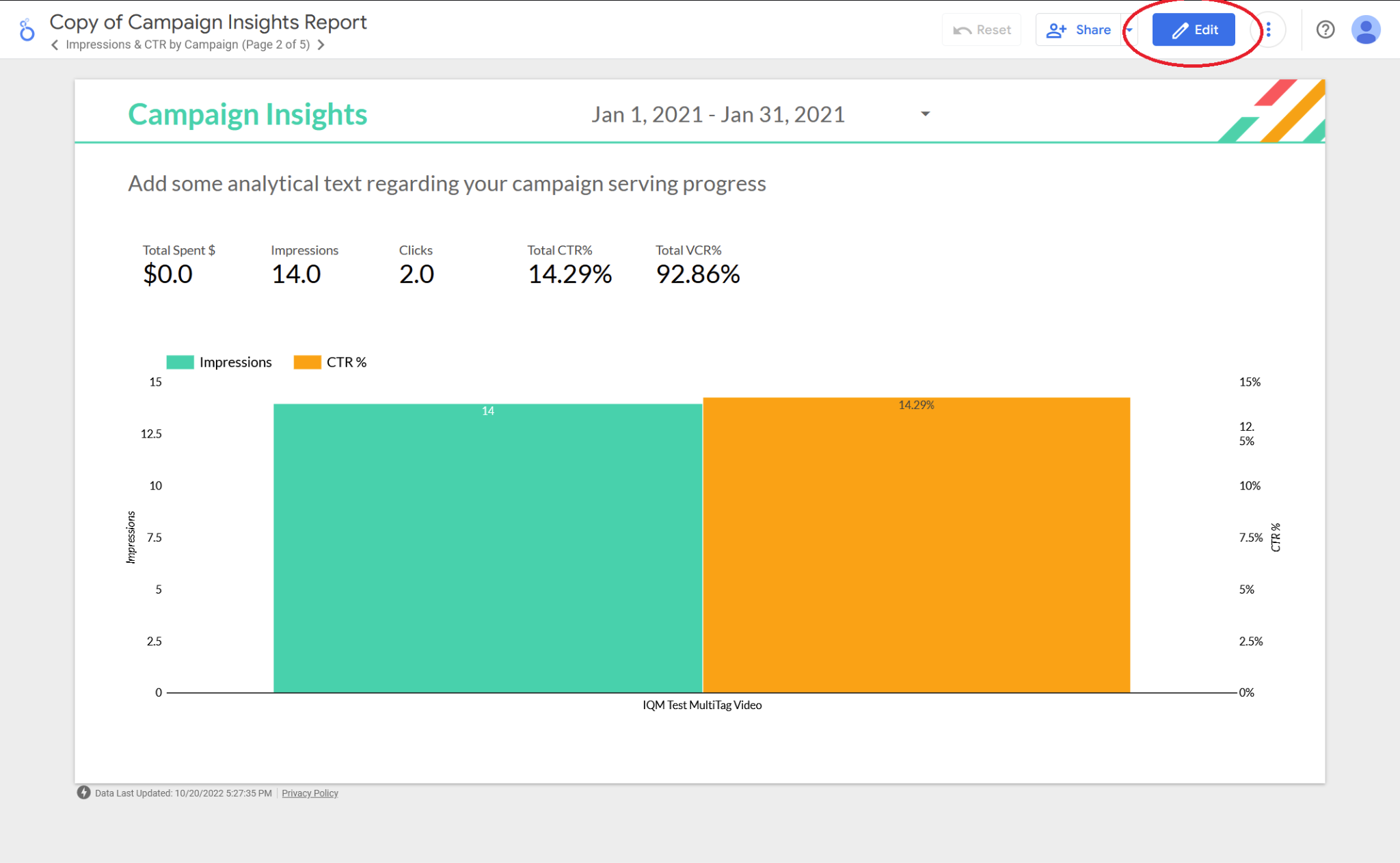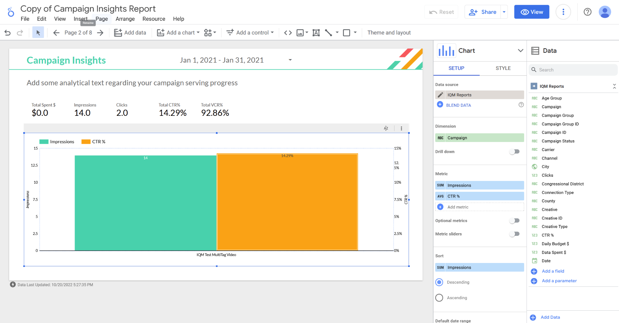 The report template provides an editable default dashboard to display your IQM ad-serving data.