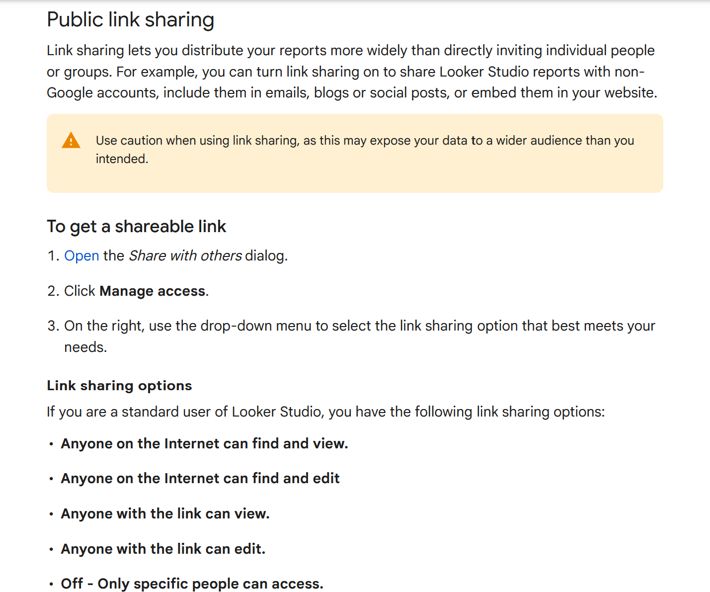 If you don't want recipients to be asked for Google Account credentials, share the report as a Public Link as described in Google Looker Studio Help.
