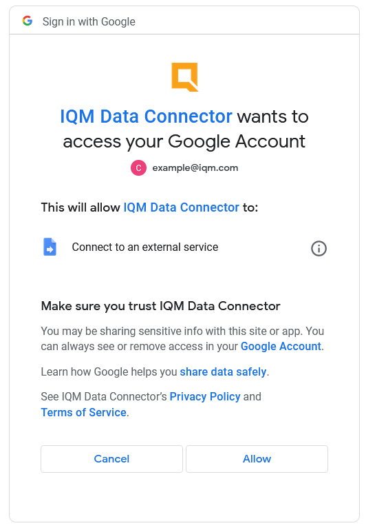When prompted, click Allow to allow the connector to connect to your Google account.