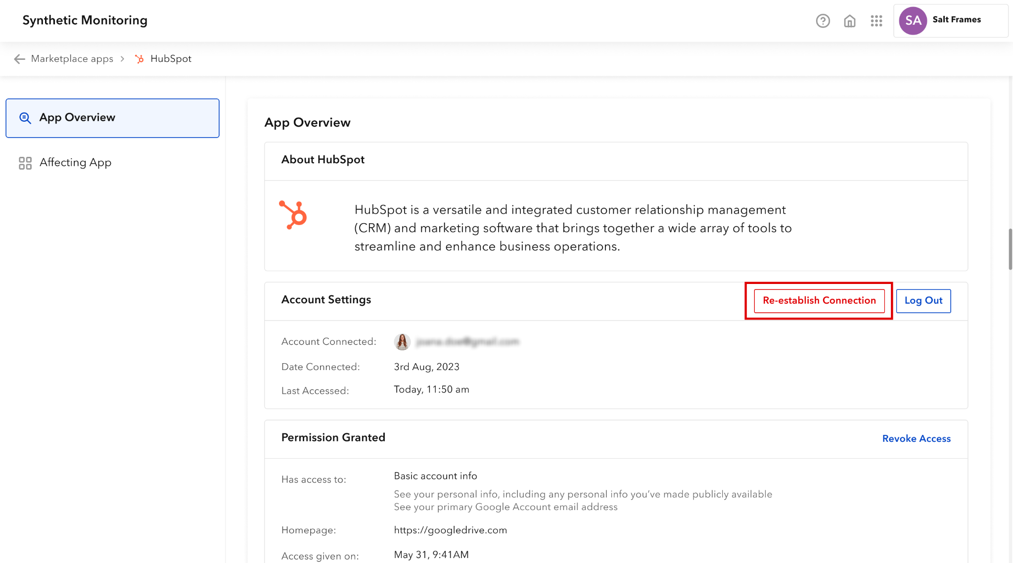 If the connected app faces connection issues, you can re-establish the connection by clicking the Re-establish Connection button.