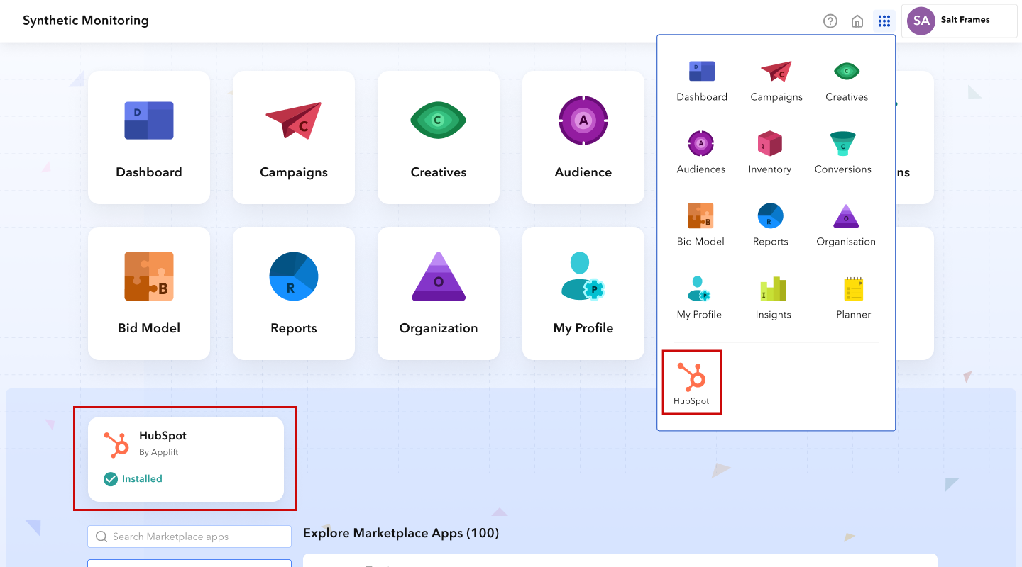 - The 9 dots icon in the top right of the header (HubSpot will appear at the bottom of the list)