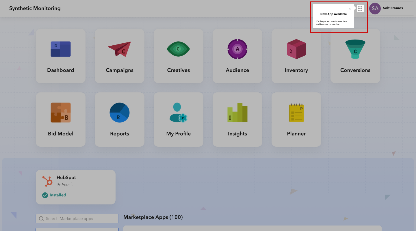 Users will be notified whenever an app is added into the platform ecosystem via the Intercom icon and the 9 dots icon in the header.