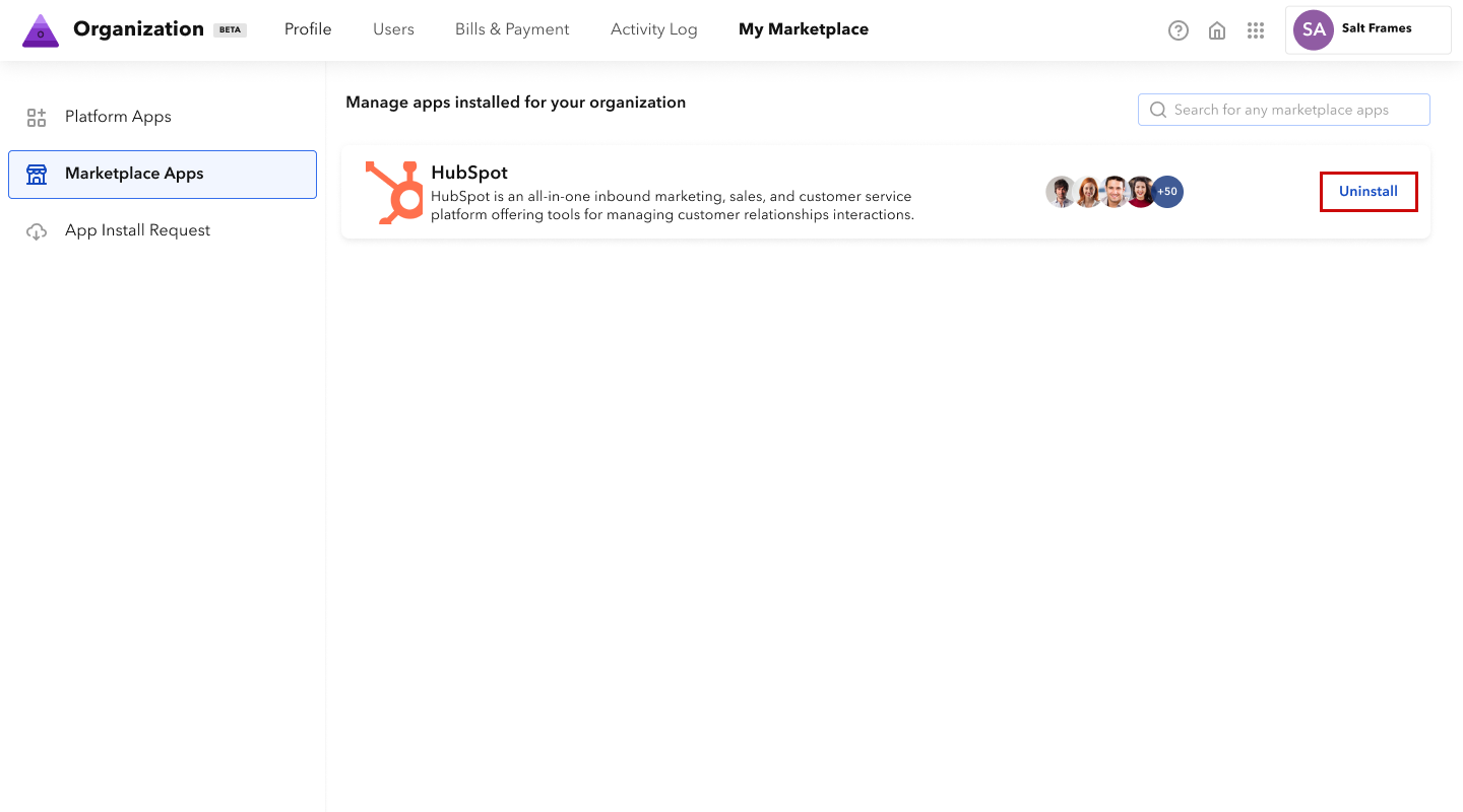 Click Uninstall in the Marketplace Apps to remove the application from the platform.