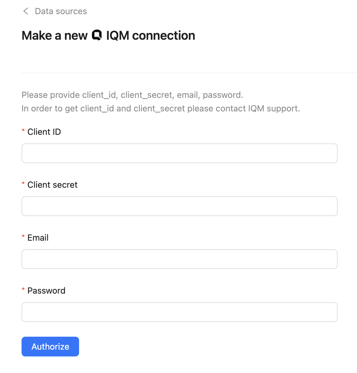- From the Data sources list, select IQM to open the Make a new connection wizard