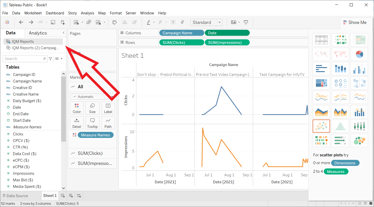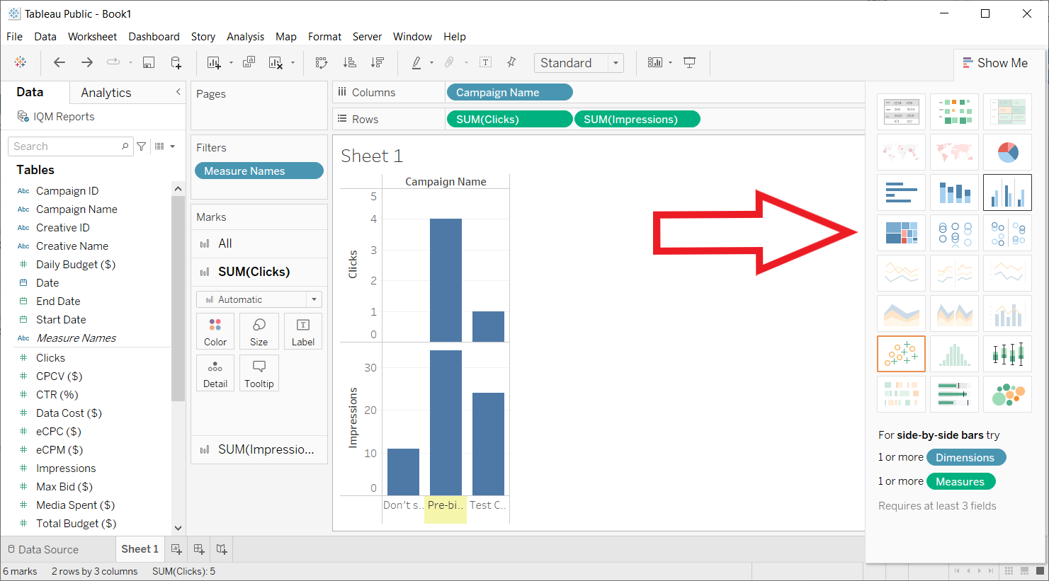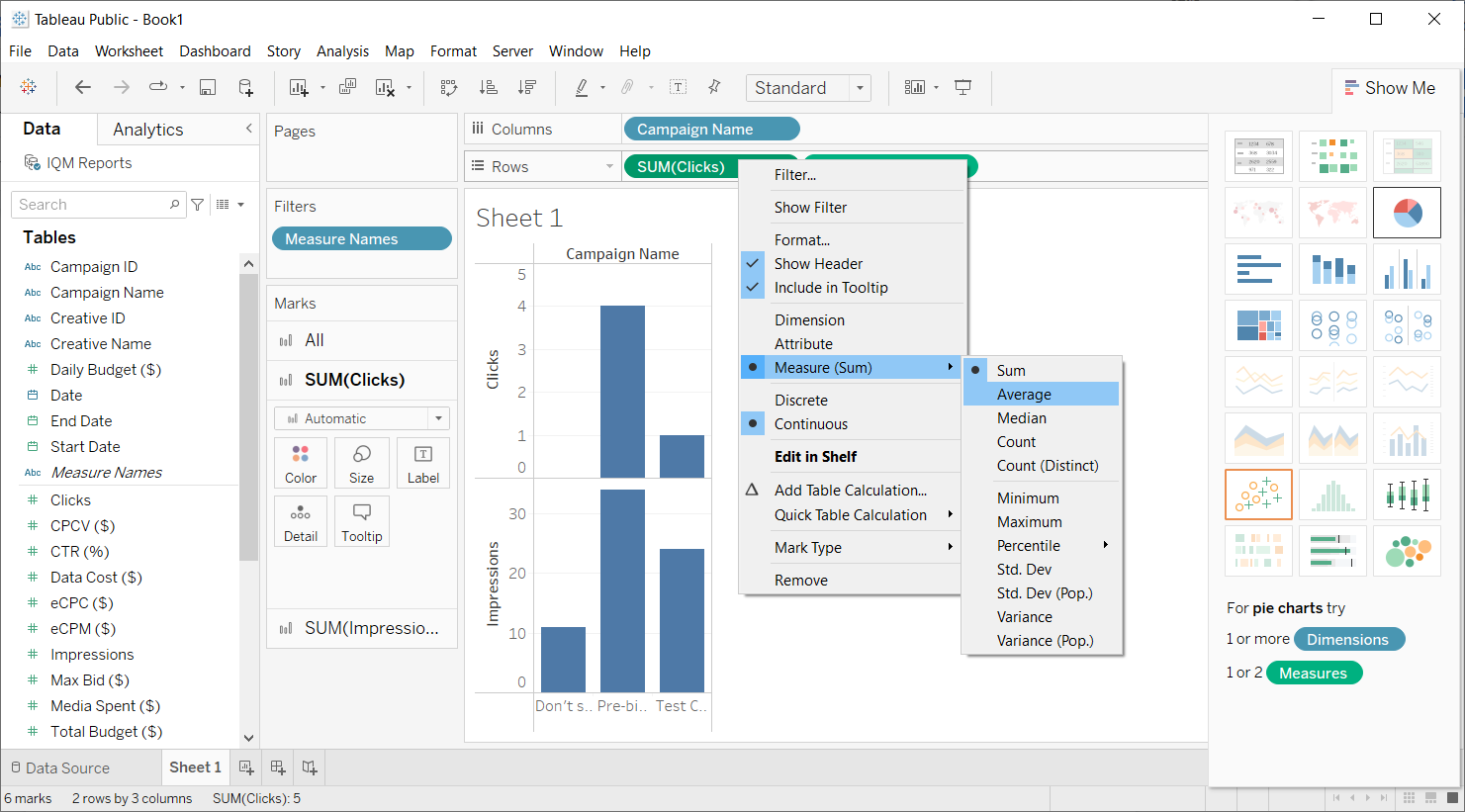 - Drag Clicks and Impressions to the Rows shelf