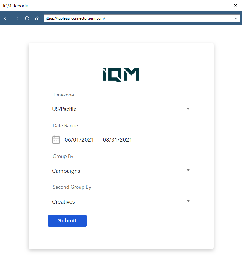 https://tableau-connector.iqm.com/into the address bar - Press Enter to load the IQM Reports web data connector
