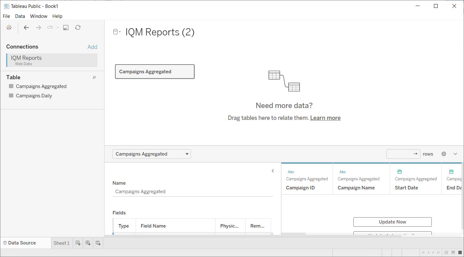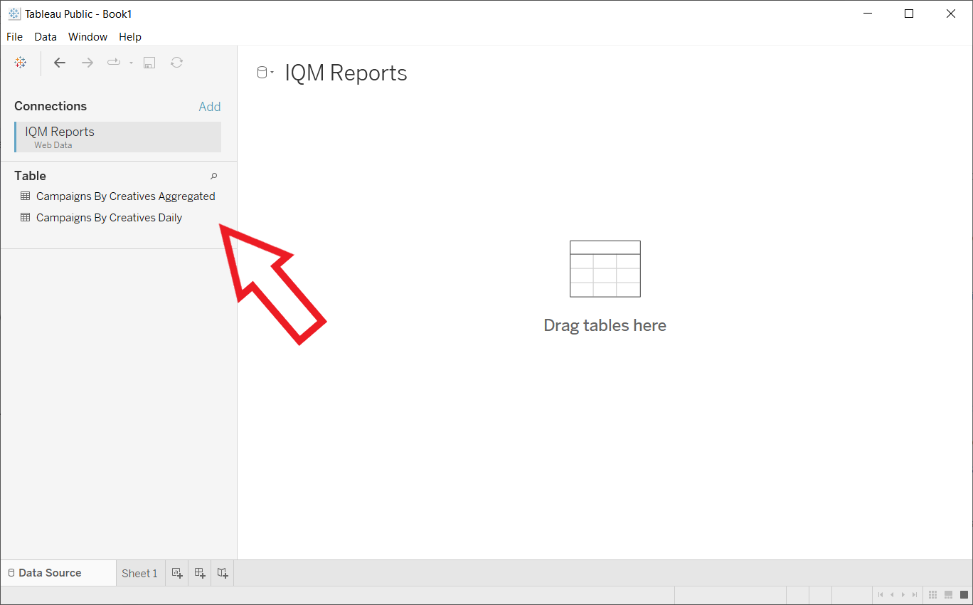When editing a data source, Tableau automatically attempts to create relationships between any tables added to the Data Source canvas by combining them on similar columns. Therefore, in order to use multiple tables with distinct Group By dimensions from the IQM Reports WDC, you will need to add a new Data Source for each IQM Reports table.