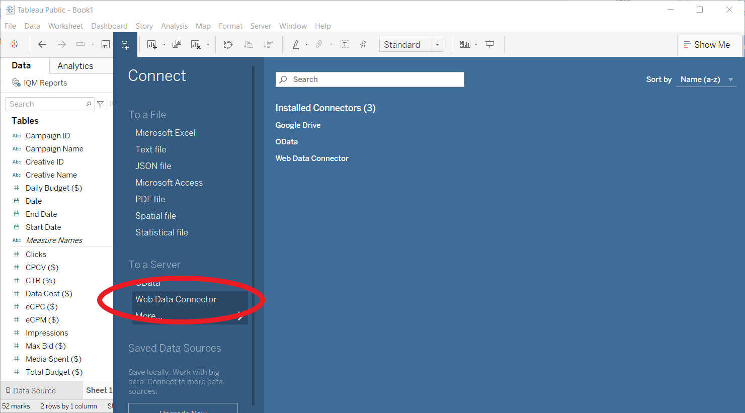 Tableau is a data visualization software used to create visual reports and dashboards from data sets imported from databases or the web. The IQM Reports web data connector (WDC) for Tableau allows users to import IQM Campaign ad-serving data into Tableau and create visual reports for data analysis.