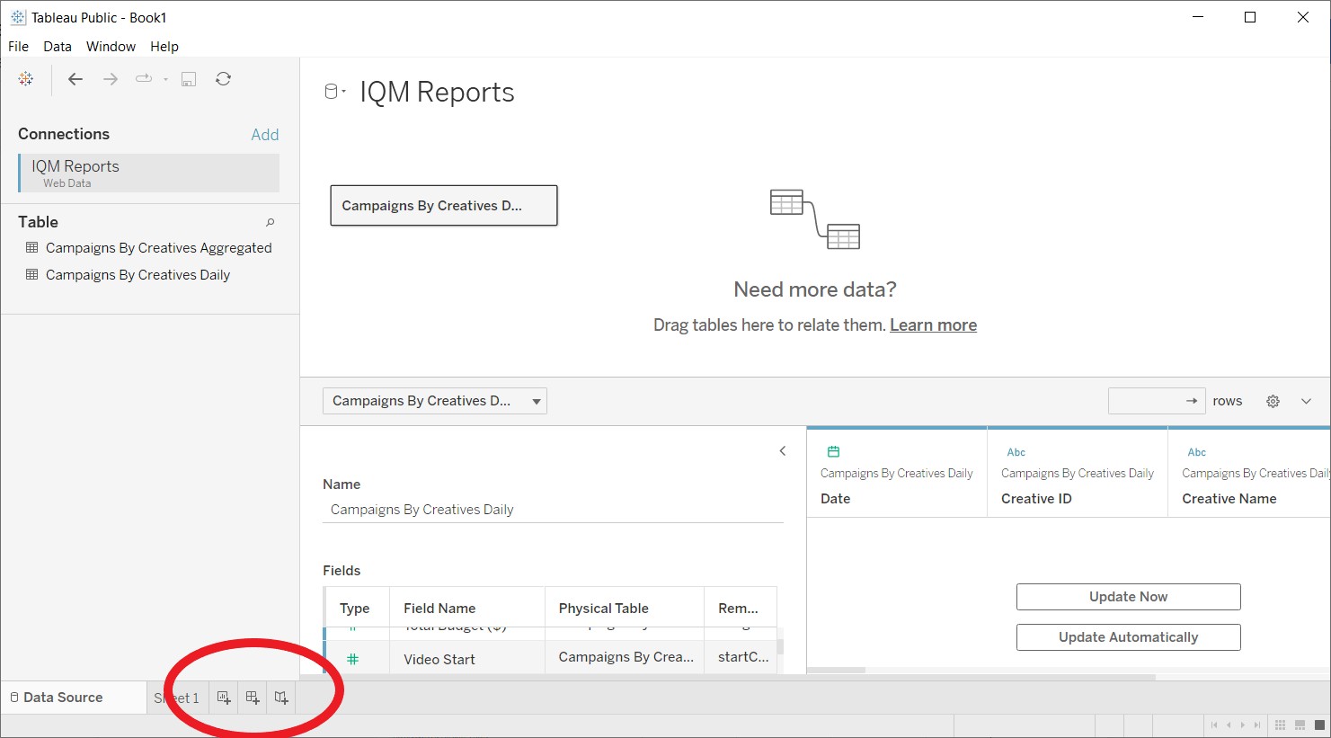 - Click on Sheet 1 in the bottom left corner to open the Tableau Workspace