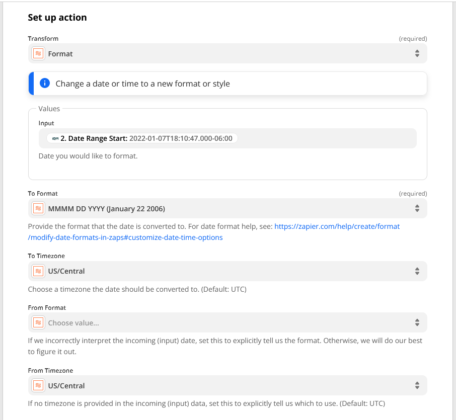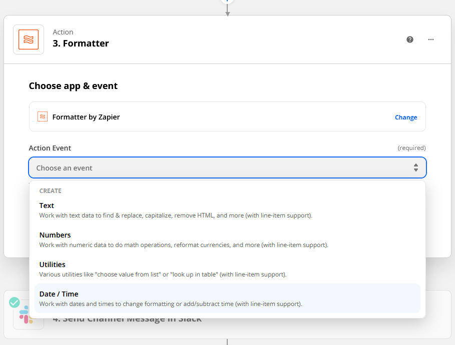 The Date Range Start and Date Range End output fields are presented in the ISO-8601 datetime format. This format is useful for computers, but not very user-friendly for a Slack message. To display these dates in a more readable format, use the Formatter by Zapier action to convert the dates. Formatter actions provide a number of useful utilities for transforming data.