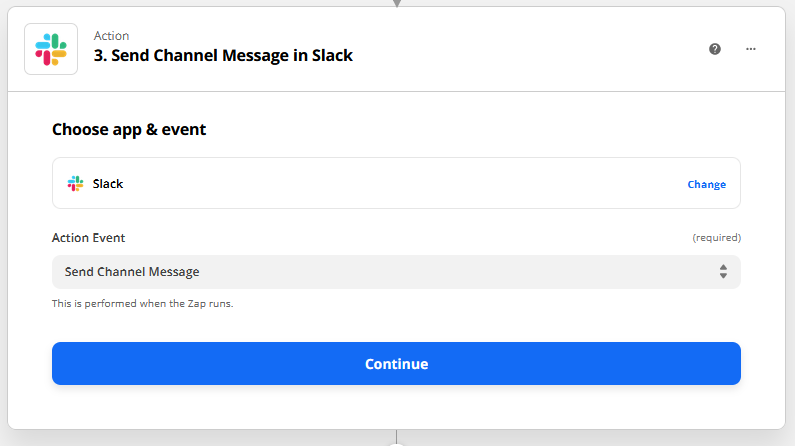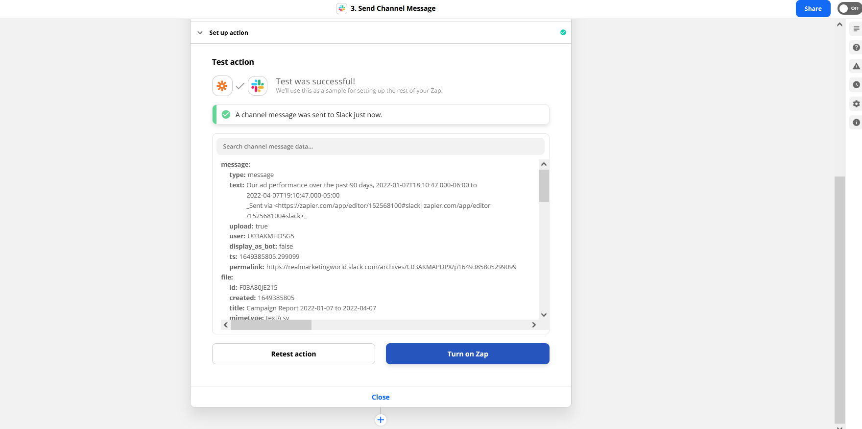 Click Continue, then test the action. You should see a message appear in the selected Slack channel with the CSV report attached.
