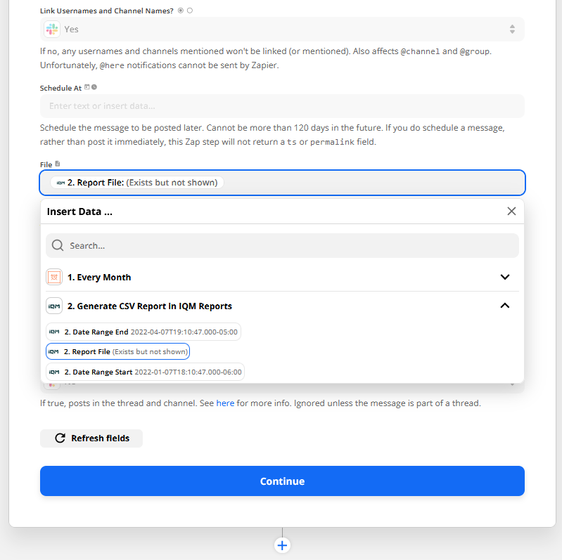 - File: Map the Report File from IQM Reports to attach the CSV report to the Slack message