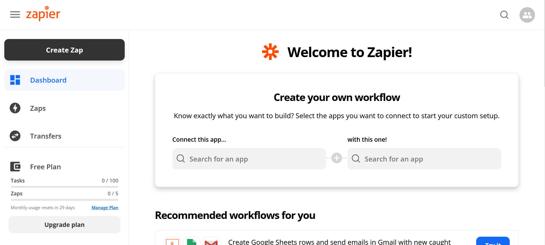 From the Dashboard, click on Create Zap. This will open the Zap editor.