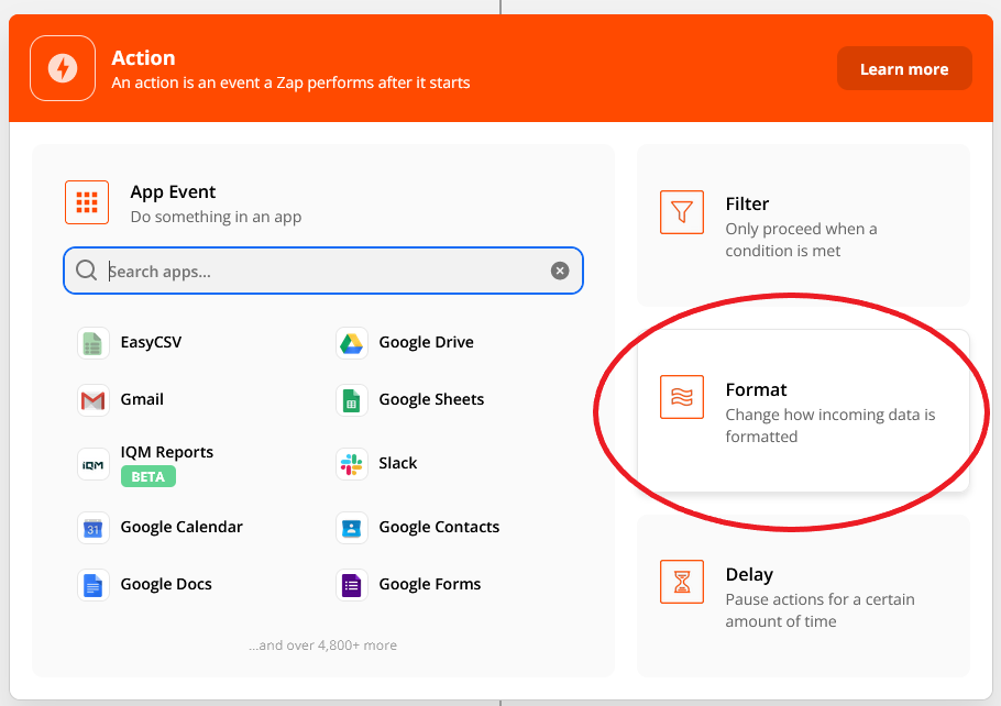 - Under Choose app & event, select Date / Time in the Action Event dropdown and Format in the Transform dropdown