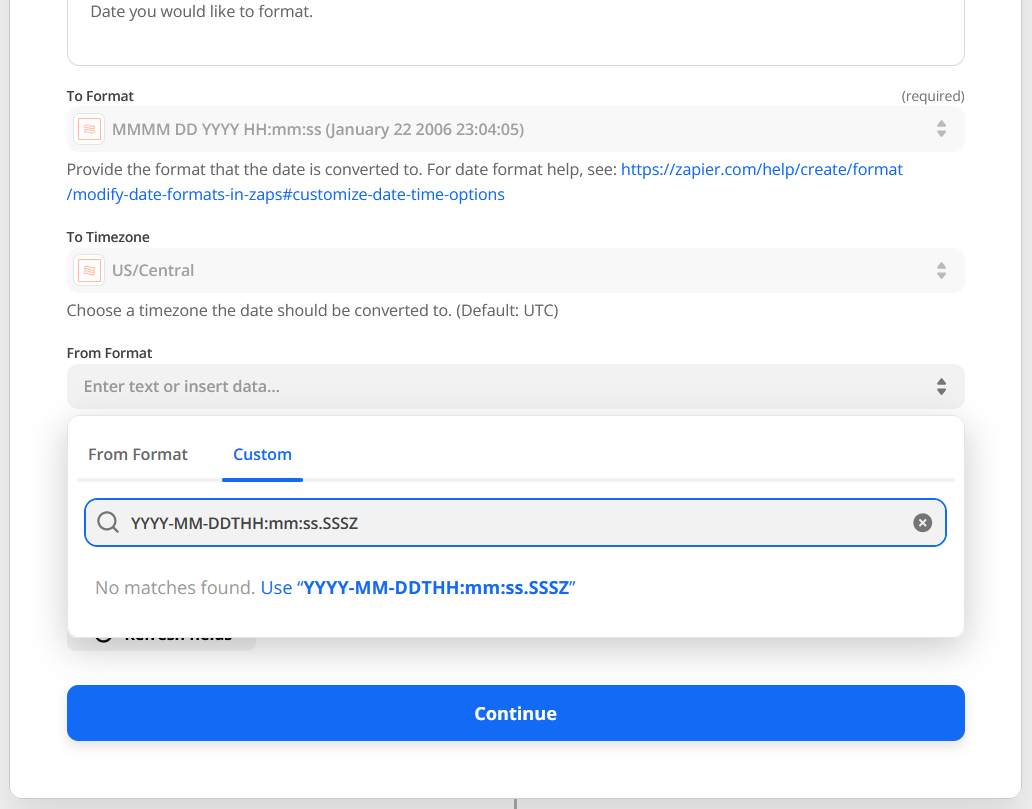 For more information about datetime patterns, see Zapier's Datetime Formatting Guide.