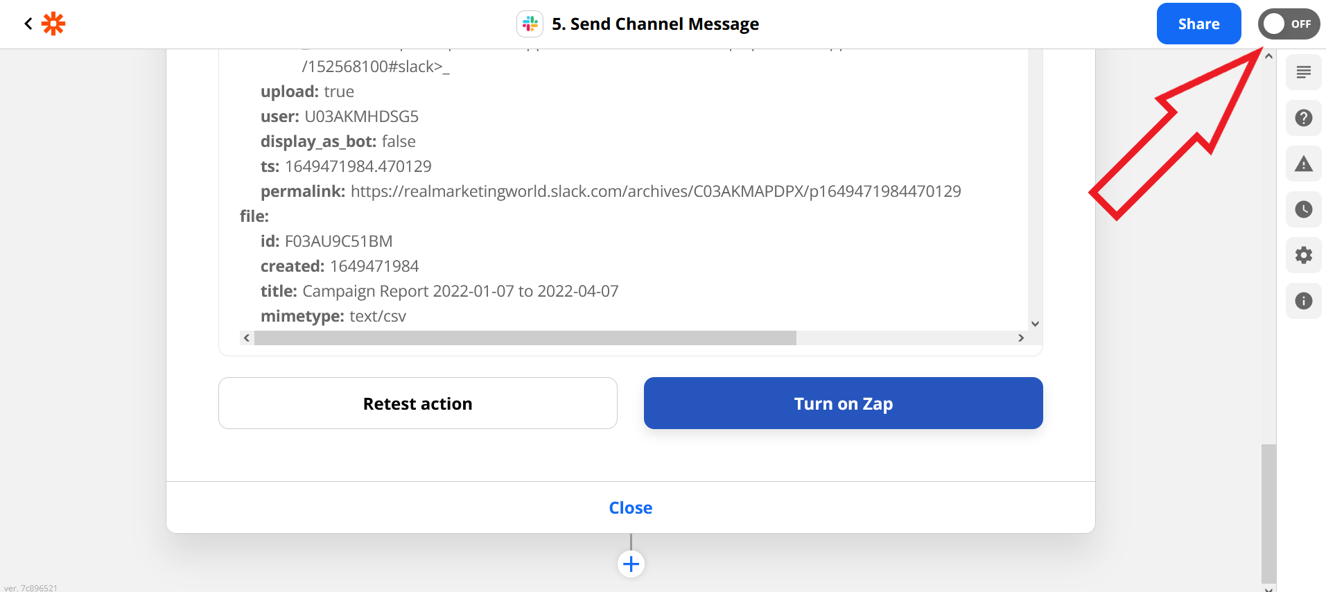 After testing the final action and verifying the expected results, turn on the Zap by clicking the Turn on Zap button or by clicking the switch in the upper right corner.