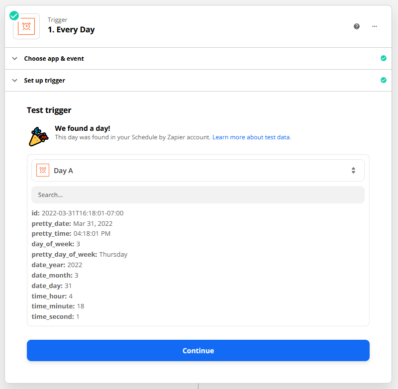 When you test the trigger, the output fields of the trigger are shown (e.g., id, pretty_date, pretty_time). The output fields of the trigger step can be mapped into the input fields of any subsequent action in the Zap.
