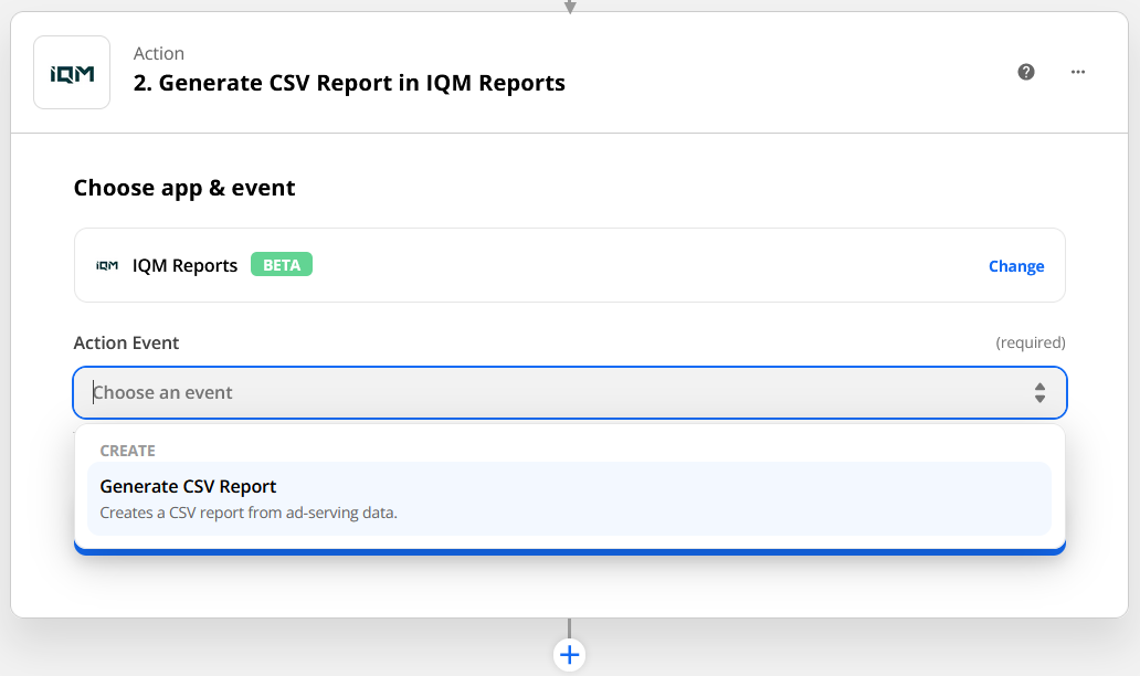 After setting up IQM Reports, you can add further actions by clicking the + symbols. This allows you to make use of the CSV ad-serving report file generated by IQM Reports by mapping it into other apps, such as Dropbox or Slack.